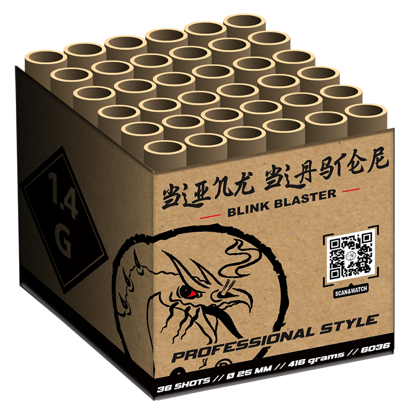 Flitsende boeketten met felle zilverblink gecombineerd met kleuren zoals rood, groen, en geel, gevolgd door dikke peony met heftige crackling. n nProductinformatie: nType product: Siervuurwerk nEffect product: Cake nTube diameter: 25mm nFanshape: Nee nClassificatie: CAT.F2 nMinimale leeftijd: 16 jaar nLegaal afsteken op: 31 december nVeiligheidsafstand: minimaal 8 meter nGeschikt voor smalle straten: Ja nGeschikt in Gemeente vuurwerkverbod: Nee Blink Blaster 36 shots 25mm Goedkoop vuurwerk kopen bij Vuurwerkwinkel Eindhoven