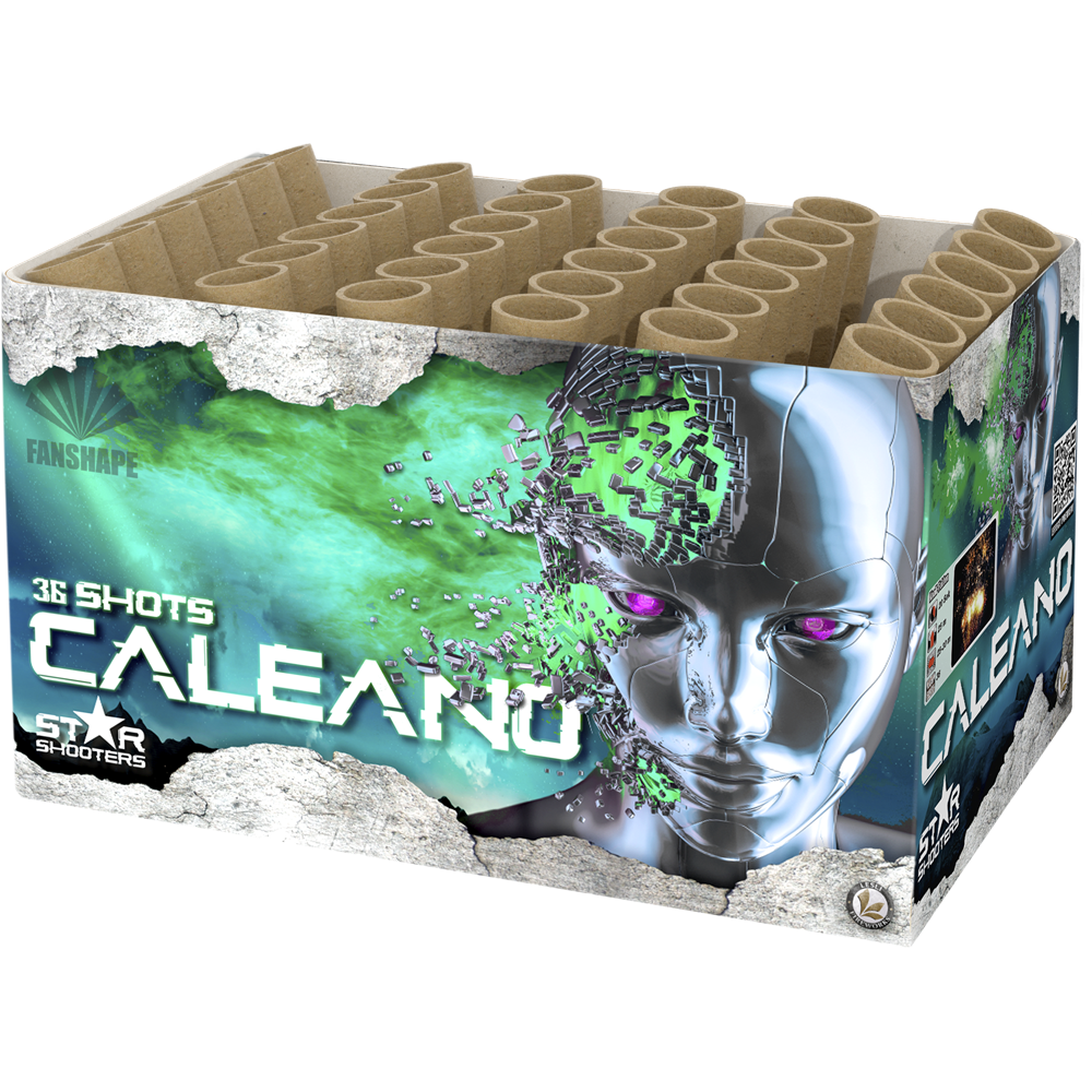 Caleano n nExtreem brede, knetterende batterij met 36 schoten in waaiervorm. Enkelvoudige verpakking n nKaliber 25 nAantal schoten 36 nBrand duur 20 Seconden Caleano Goedkoop vuurwerk kopen bij Vuurwerkwinkel Eindhoven