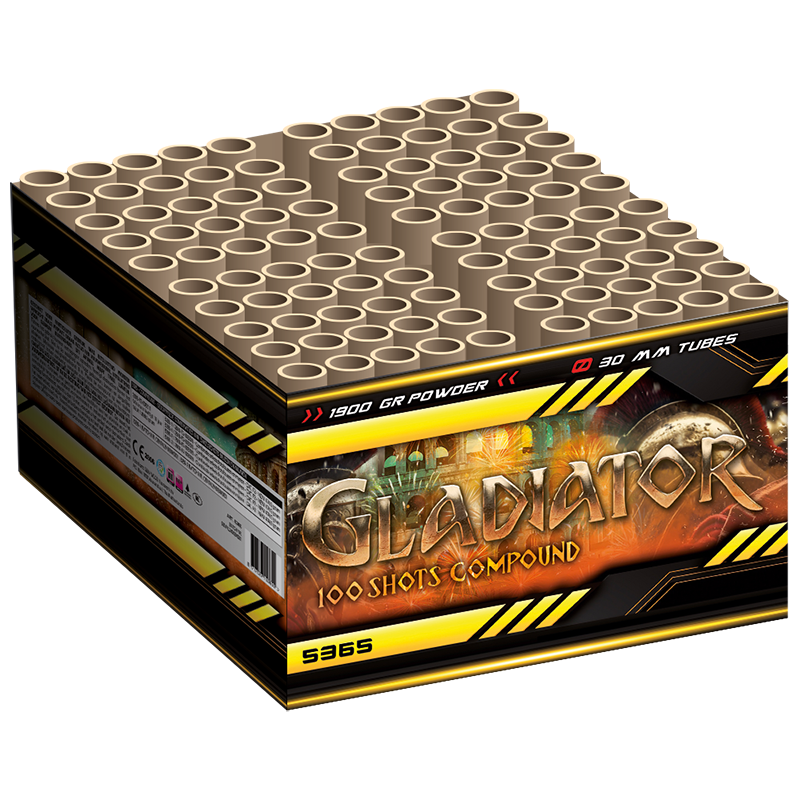 Gladiator, 100 shots 30mm compound. Deze compound heeft het maximale formaat van 30mm buizen, hierdoor kunnen de grootste haalbare effecten geschoten worden. Goud met rode glitters, puur gouden glitterpalm, en een mega snelle ramfinale.