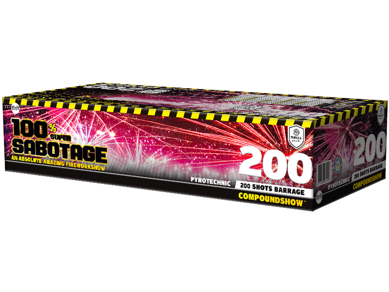 Sabotage nHet kenmerkende aan deze compound is dat hij op zeer mooie manier blinkers, kometen, peonies en meer combineerd in een totaal nieuwe ervaring van vuurwerk! n nKruitgewicht 1957 Gram nTube diameter 20 nBrandtijd 95 Seconden nHoogte 20 m. – 25 m. Sabotage Goedkoop vuurwerk kopen bij Vuurwerkwinkel Eindhoven