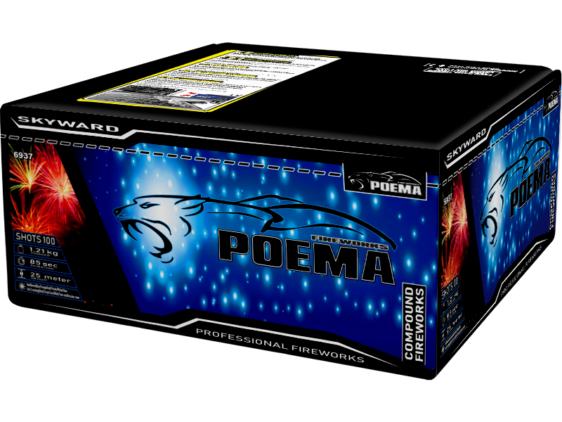 Skyward nDe Skyward is een mooie compound cake uit de nieuwe Poema serie met 100 shots! n nKruitgewicht 1210 Gram nTube diameter 25 nBrandtijd 85 Seconden nHoogte 25 m. – 30 m. n